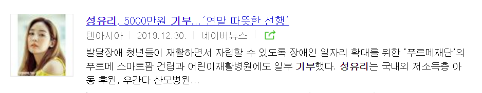 이번 기사를 접하면서 성유리의 기부 내역을 찾아봤는데, 정말 꾸준하게 다양한 계층을 위해 기부를 해왔더라구요. 또한 금액의 액수가 중요한 것은 아니지만 금액 마저도 정말 큰 금액을 꾸준히 기부해온 것을 보며 '아 이 사람은 진짜구나'라는 생각을 하게됐습니다.