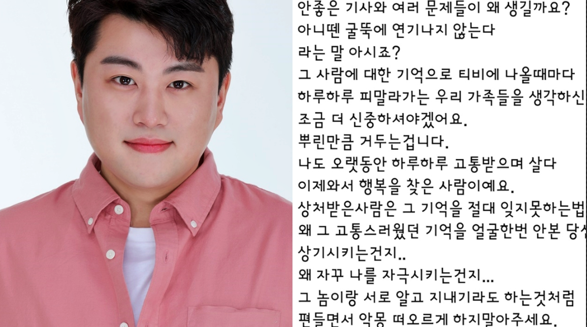 이어 A씨는 “뿌린 만큼 거두는 것이다. 나도 오랫동안 하루 하루 고통 받으며 살다 이제 와서 행복을 찾은 사람이예요, 상처 받은 사람은 그 기억을 절대 잊지 못하는 법”이라며 "왜 그 고통을 얼굴 한 번 안 본 당신들이 상기시키는지, 왜 나를 자극시키는지“, "더 이상 내 가족 건들지 마라. 나도 이제 안 참는다”고 김호중의 팬들을 향해 경고하기도 했습니다.