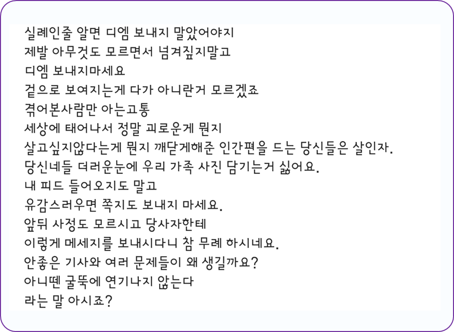 최근 김호중의 전 여자친구 A씨는 자신의 인스타그램에 팬들이 보낸 악플을 공개하며 “겉으로 보이는 게 다가 아니란 거 모를 것이다. 겪어본 사람만 아는 고통. 세상에 태어나서 정말 괴로운 게 뭔지, 살고 싶지 않다는 게 뭔지 깨닫게 해준 인간 편을 드는 당신들은 살인자”라고 분노를 표하기도 했습니다.