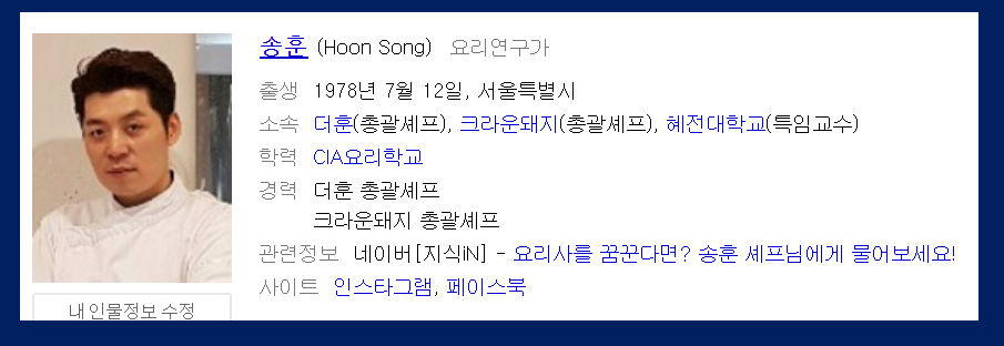 CIA 요리학교를 졸업했고, 현재 더훈, 크라운돼지의 총괄셰프 및 혜전대학교의 특임교수로 임명되어있습니다.