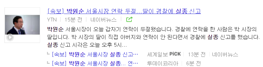 안녕하세요! 오늘도 어김없이 일을 마치고 인터넷 뉴스란을 들어가봤는데, 박원순 서울시장이 연락이 두절되어 박 시장의 딸이 직접 경찰에 실종 신고를 했다고 합니다.