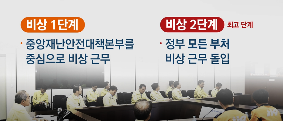 비상 1단계는 중앙재난안전대책본부를 중심으로 비상 근무를 하는 형태이고, 비상 2단계는 최고 단계로 정부 산하 모든 부처가 비상 근무에 돌입하는 것을 말합니다.