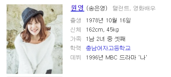 그로부터 1년 후 2003년, 연기에 대한 갈증으로 은퇴를 번복하고 '원영'이라는 예명으로 다시 연예계로 복귀하게 됩니다. But, 팬들의 마음은 이미 떠나간 상태였을까요, 송은영의 인기는 예전만 하지 못했고, 드라마에 출연했으나 대중들에게 이렇다할 인상을 남기지 못했습니다.