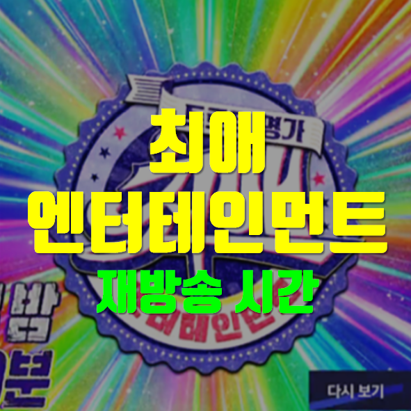 이번주 최애 엔터테인먼트 재방송 시간은 7/31(금) 21:50 / 22:30 으로 잡혀있습니다. 혹시 이 글을 이후에 보시는 분들은 포털 사이트에 "최애엔터테인먼트 재방송"을 검색한 후 '편성표'를 클릭하시면 재방송 시간을 쉽게 확인하실 수 있습니다.